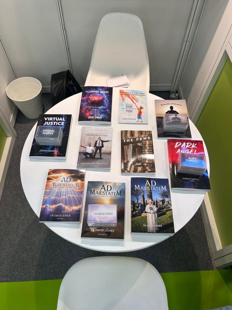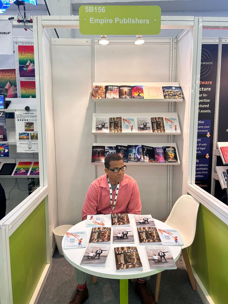 Author Thibou Ershwyn at The Empire Publishers Booth: 5B156 during The London Book Fair, Day 01. On the table and shelves, he is showcasing his featured titles, including A Voice From the Pews, The Boy Who Cried Race, and His Grace Is Sufficient, His Mercy Is Everlasting.