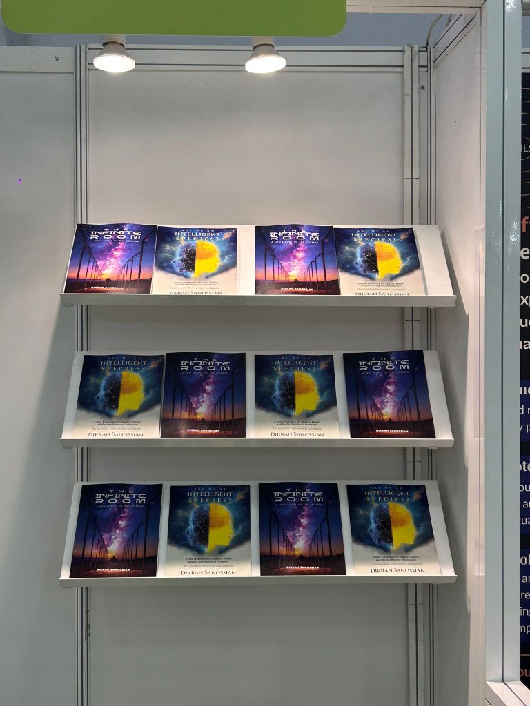A display shelf at The Empire Publishers (Booth: 5B156) during The London Book Fair 2026, Day 01, featuring multiple copies of the titles The Infinite Room: A New Model of the Cosmos and Are We an Intelligent Species? A New Framework for Science, Ethics, and the Intelligence of Existence, both authored by Dikran Sanossian.