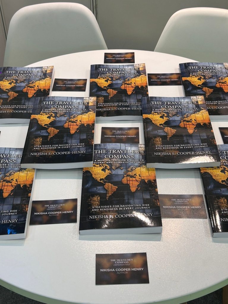 A display table at The Empire Publishers, Booth 5B156 during The London Book Fair 2026, Day 01, spotlighting the book The Traveler’s Compass: A Modern Traveler’s Guide to Global and Domestic Security by author Nikisha Cooper Henry. The table is arranged with multiple copies of the book and corresponding author promotional cards, offering strategies for navigating risk and readiness for travelers.