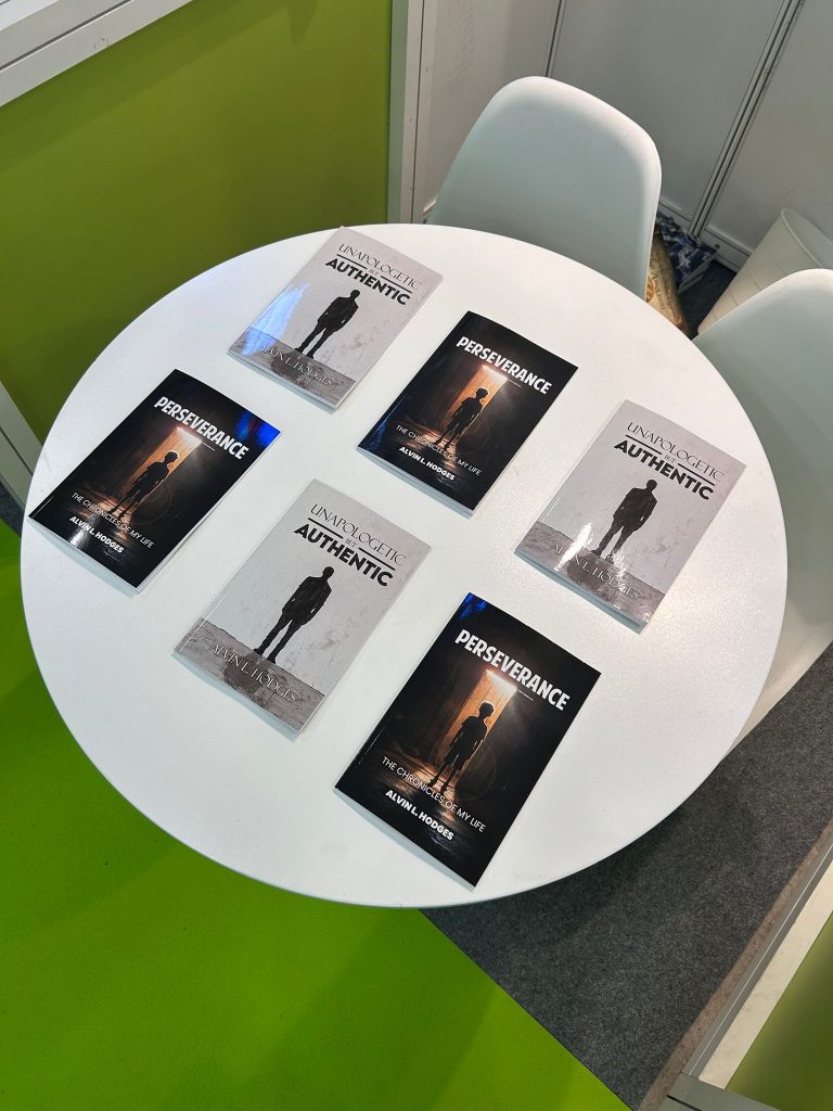 A display table at The Empire Publishers, Booth 5B156 during The London Book Fair 2026, Day 01, showcasing works by author Alvin L. Hodges. The table features an arrangement of his books, including Perseverance: The Chronicles of My Life and Unapologetic but Authentic.