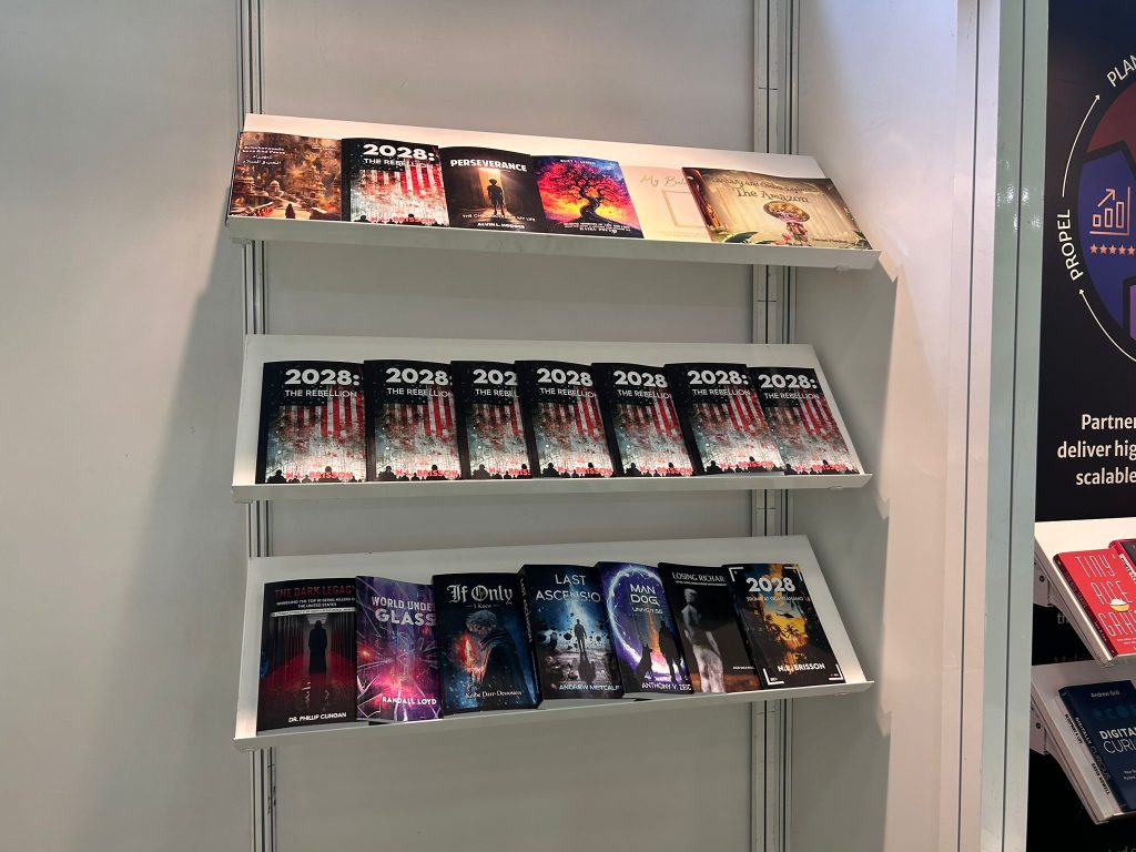 A display shelf at The Empire Publishers, booth 5B156, showcasing a diverse collection of titles including The Dark Legacy by Dr. Phillip D. Clingan, The Portals by Oliver John Calvert, If Only I Knew by Kolbe Darr-Desrosiers, Last Ascension by Andrew Metcalf, A Man, a Dog, and the Universe: A Mission to Save the Future by Anthony V. Zeid, World Under Glass by Randall Loyd, and 2028: The Rebellion by N.L. Brisson.