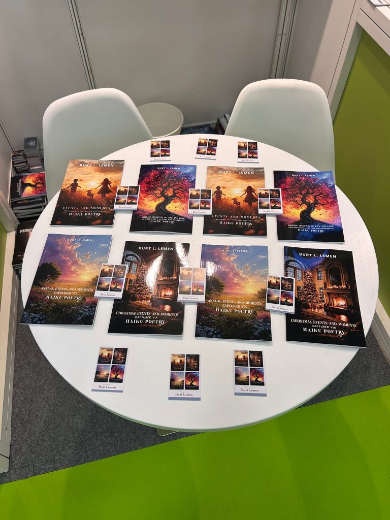 A display table at The Empire Publishers, Booth 5B156 at The London Book Fair 2026, Day 01, featuring the poetry collection of Burt L. Lemen. The display highlights his latest work, arranged alongside promotional materials for his broader haiku series, which focuses on capturing life’s special occasions and sensory experiences.