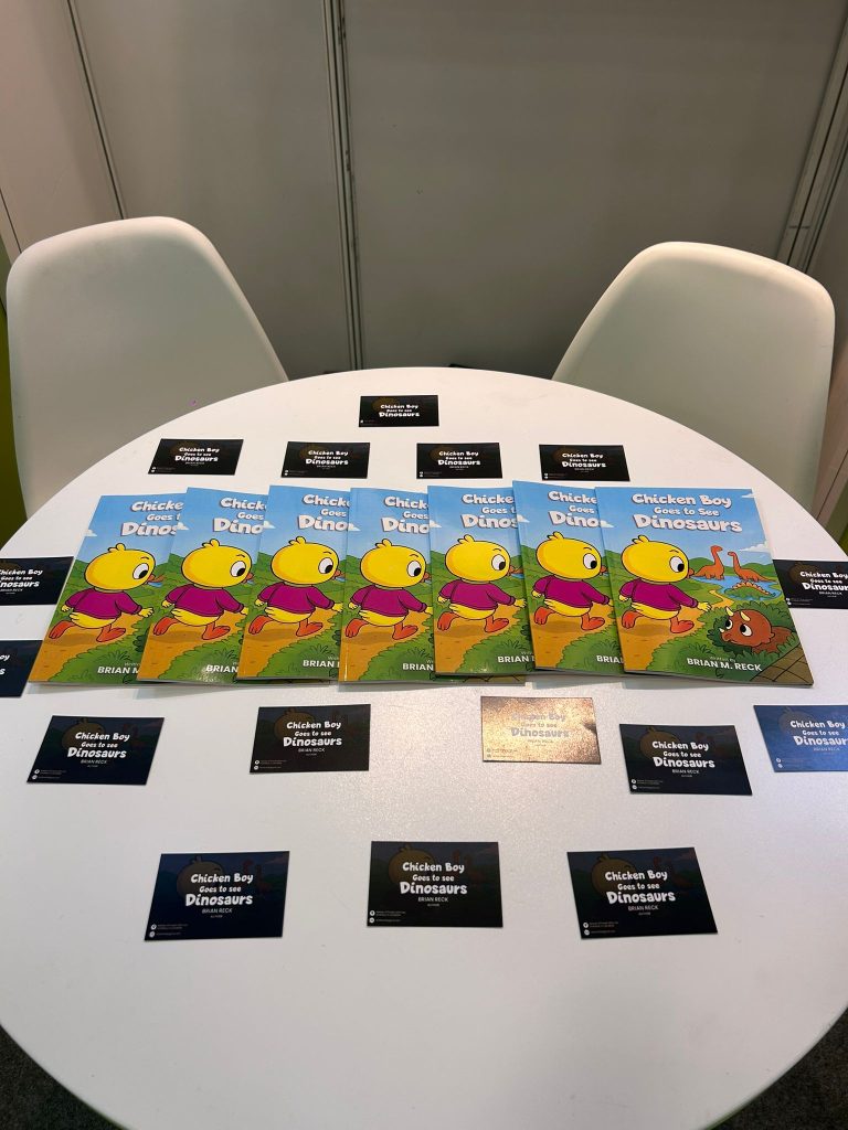 A display table at The Empire Publishers, Booth 5B156 at The London Book Fair, Day 01, featuring the children’s book Chicken Boy Goes to See Dinosaurs by Brian M. Reck. The setup includes multiple copies of the book arranged alongside author promotional cards.