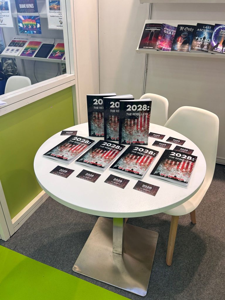 A display table at The Empire Publishers, Booth 5B156, Day 01, during The London Book Fair, spotlighting the novel 2028: The Rebellion by N.L. Brisson. The setup features multiple copies of the book arranged alongside promotional cards, with additional titles from The Empire Publishers catalog visible on the shelves behind the table.